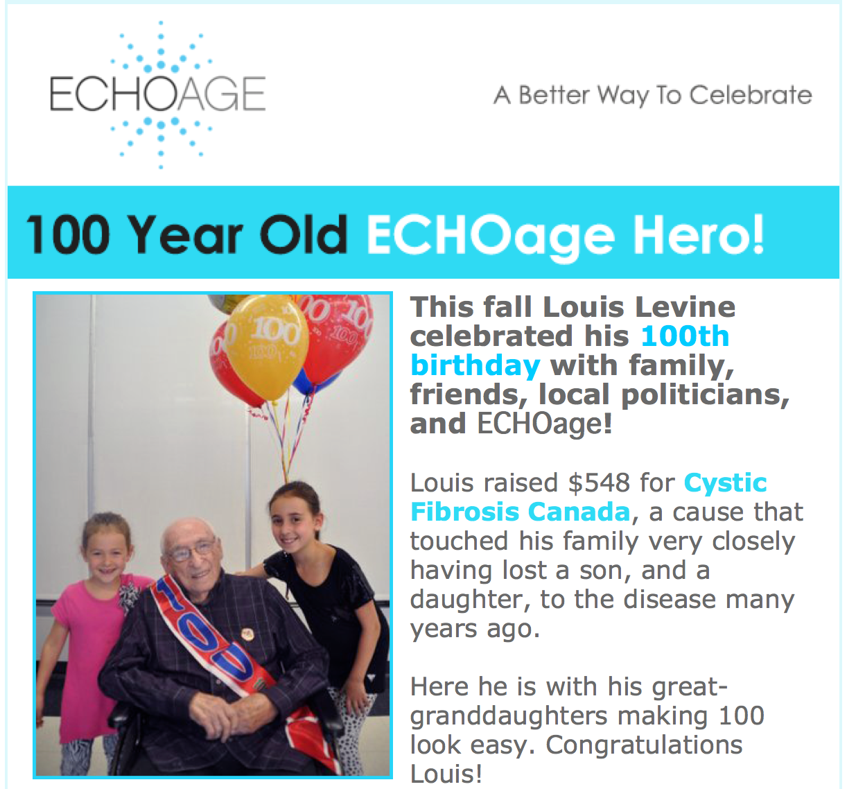 100 Year Old ECHOage HERO celebrates in support of Cystic Fibrosis Canada.