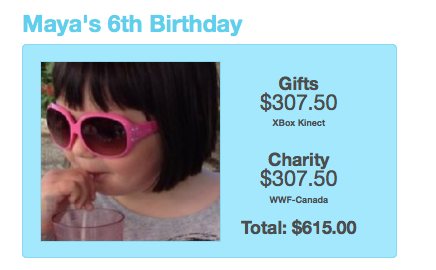 For Maya’s 6th birthday party she got an X-Box and WWF got $307!