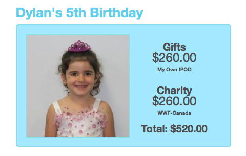 For her 5th birthday, Dylan got her own Ipod, and WWF got $260!