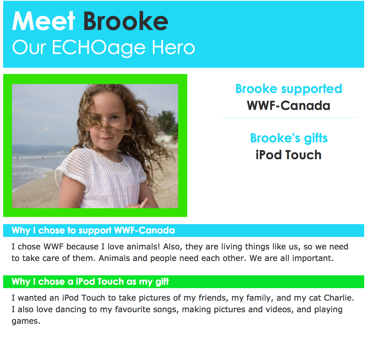Louise, Dylan’s proud mother, adds: “ECHOage helps me teach my children about being generous and caring. It is amazing that while teaching my daughter compassion, she also got to choose a big birthday gift. I recently heard her tell someone that the iPod she got was a gift from all of her friends. That is a gift she will always remember!”